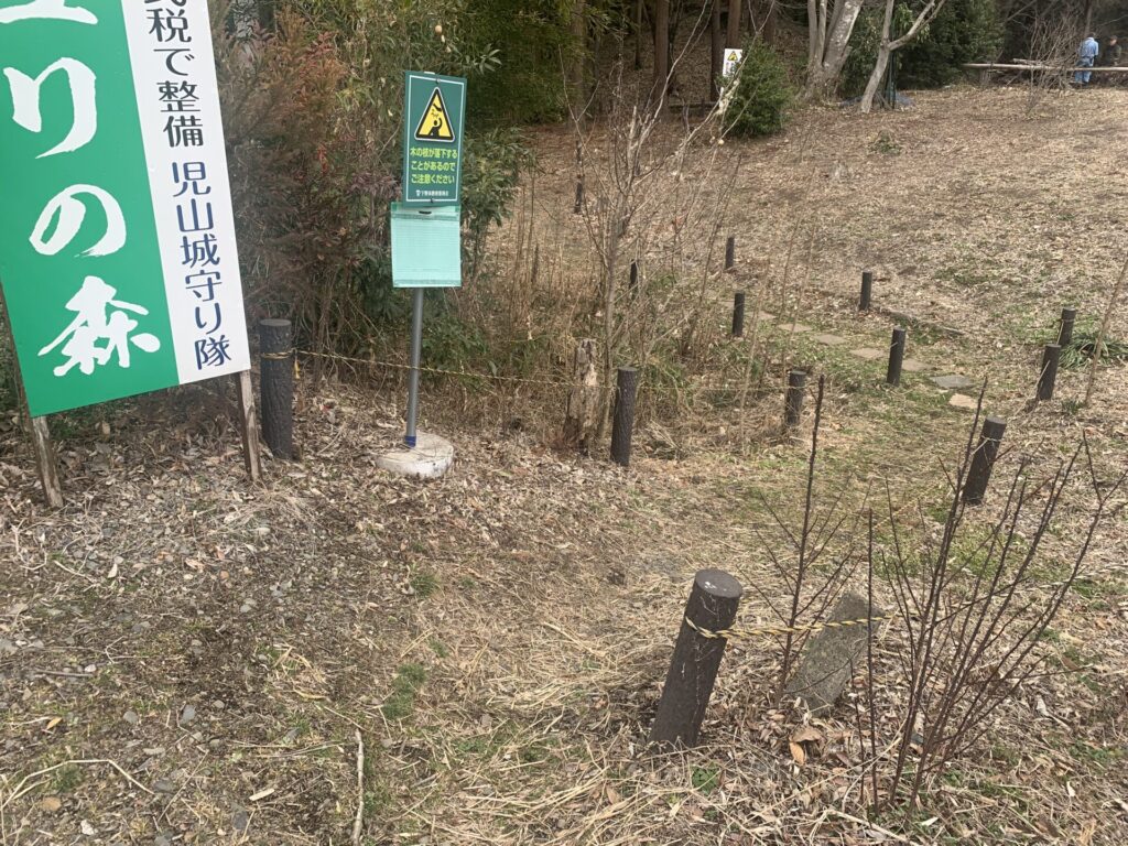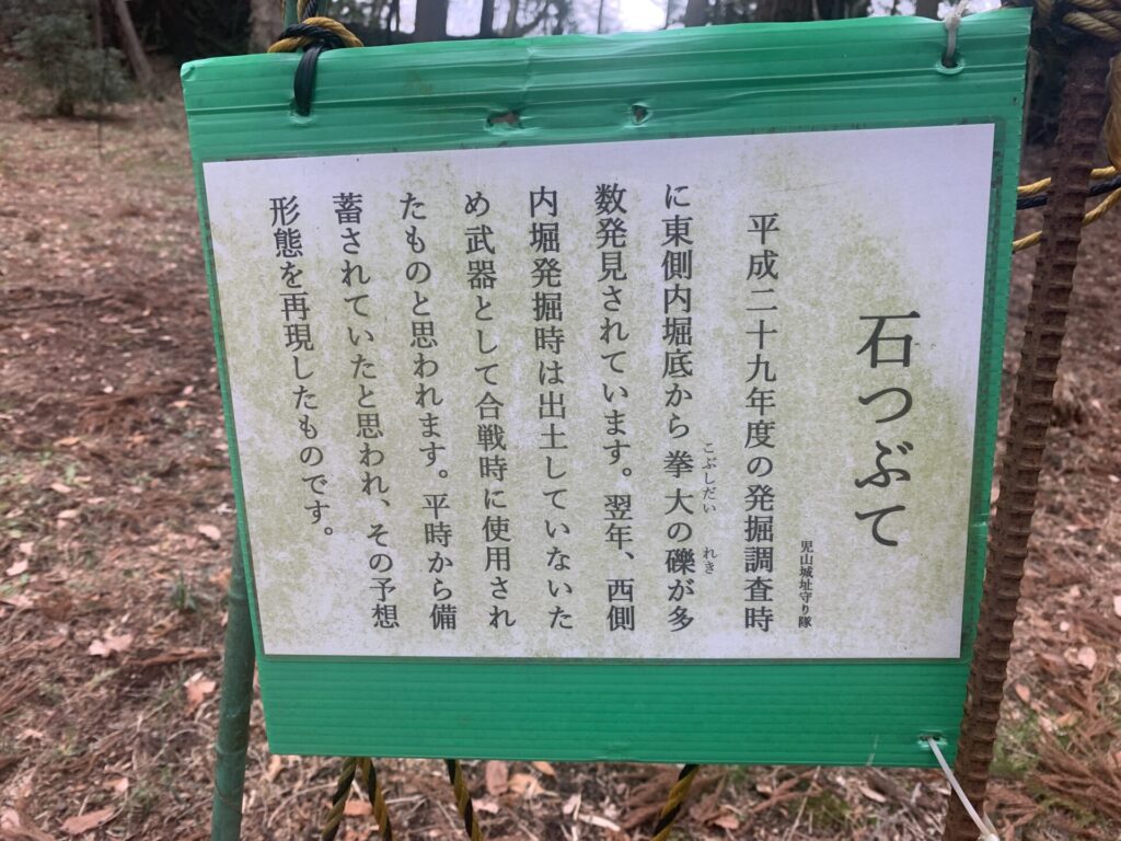 「児山城守り隊」(城跡保存会)の方々が発掘調査時のものを分かりやすいように置いてくれてるようです。