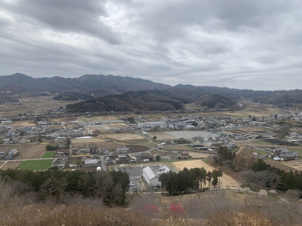 奥に見える山が皆川城です。