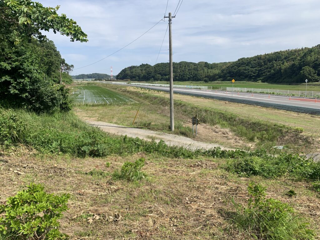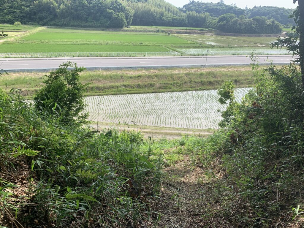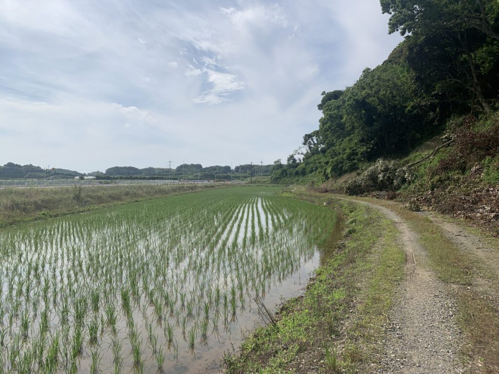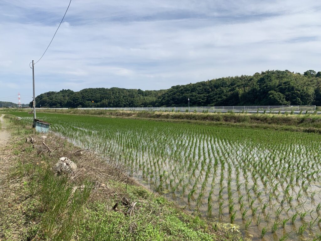 奥に田んぼが広がっています。