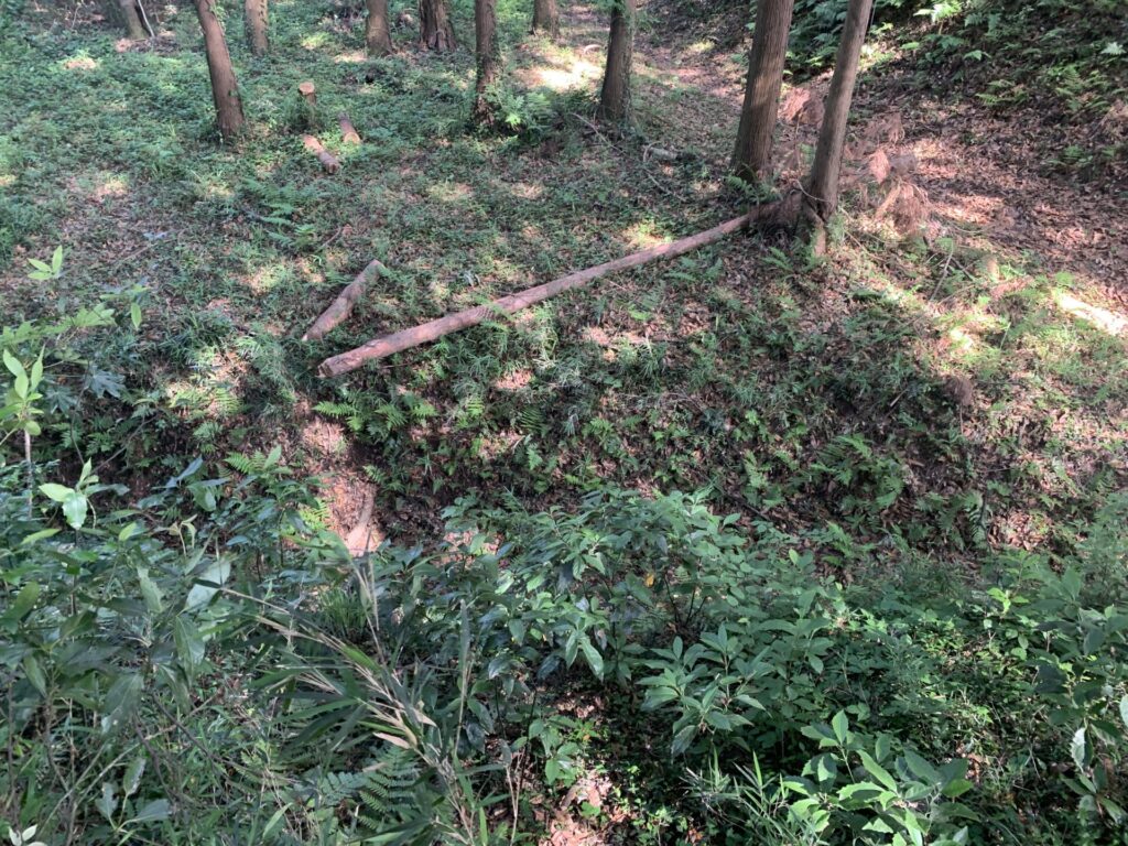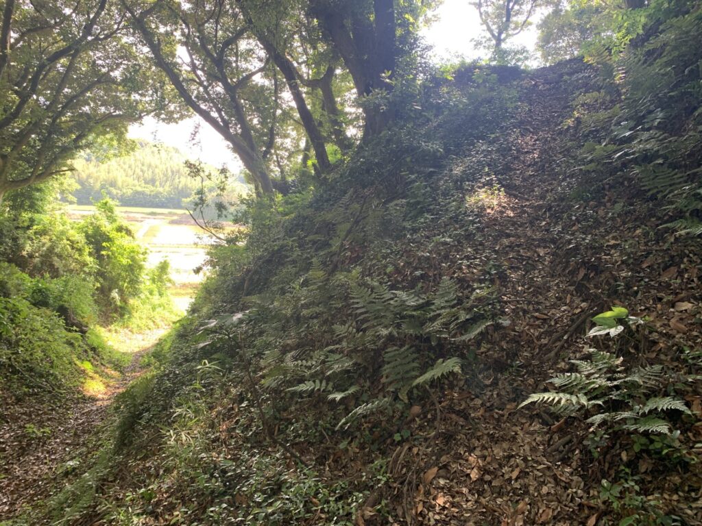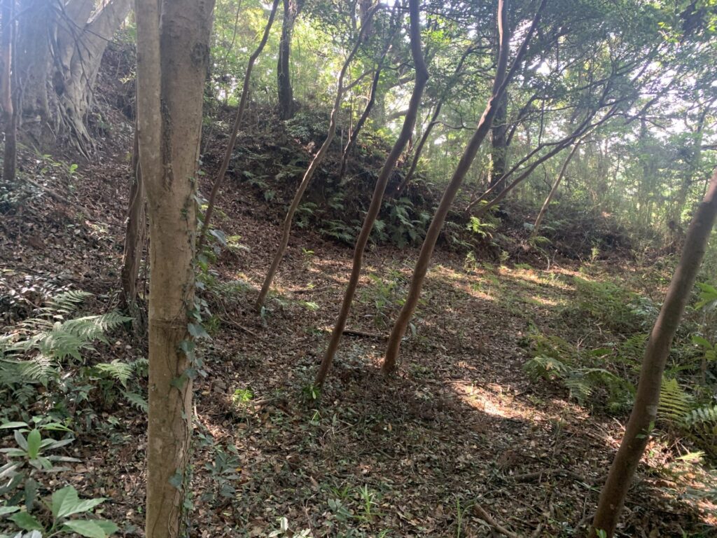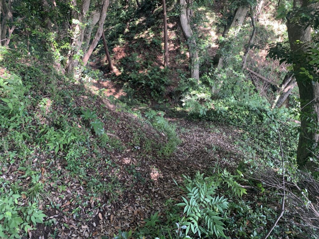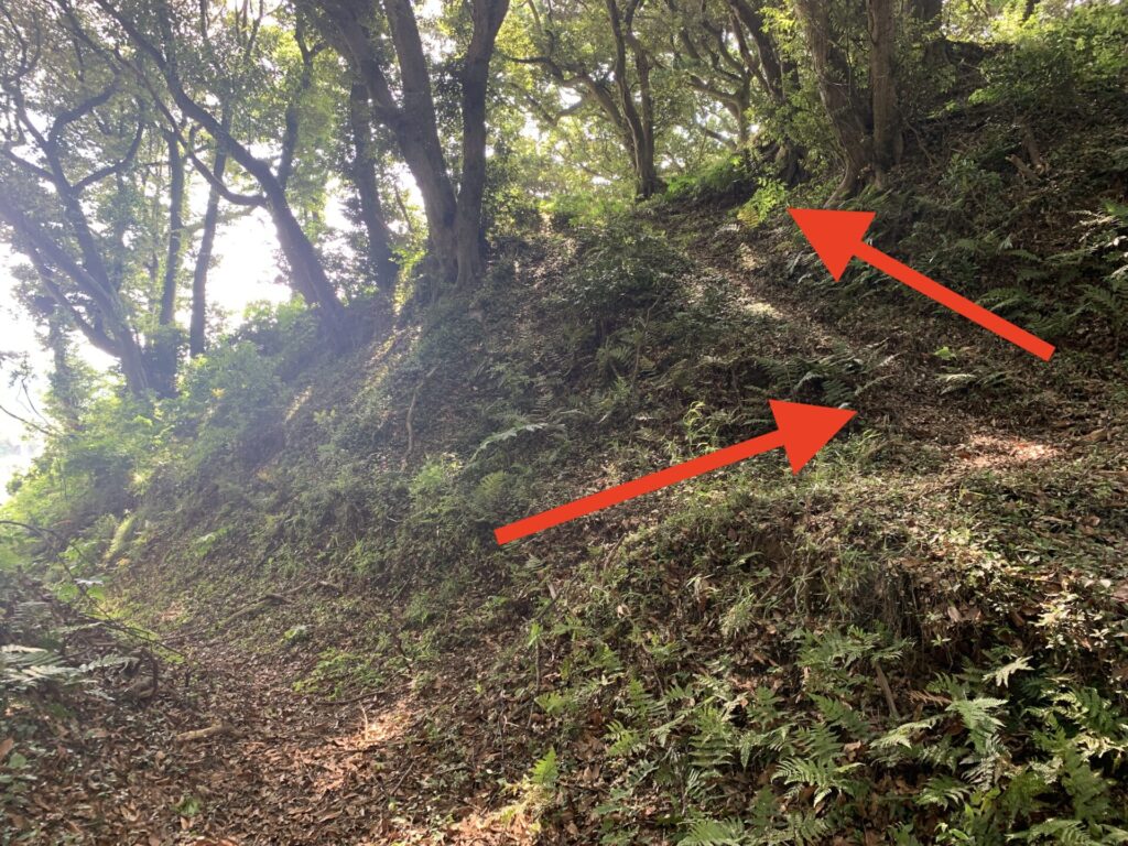 山腹の斜面を平に削り、下から攻め登る敵兵を迎撃するための防御スペースです。