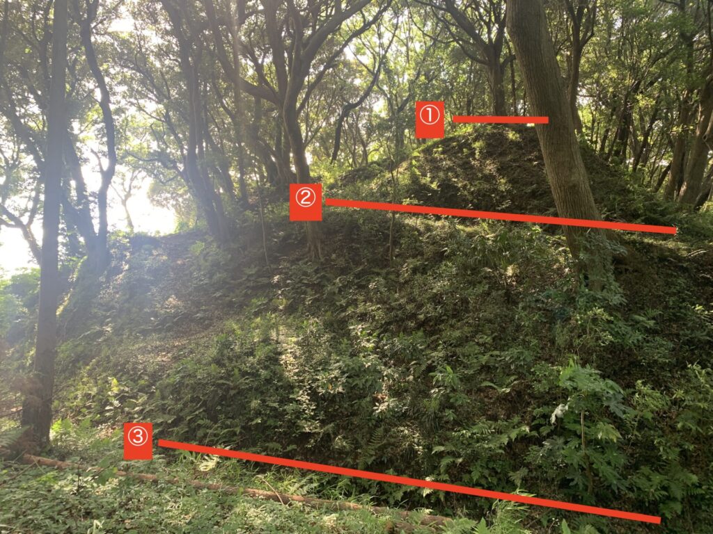 ①の線が土塁のてっぺんになります。