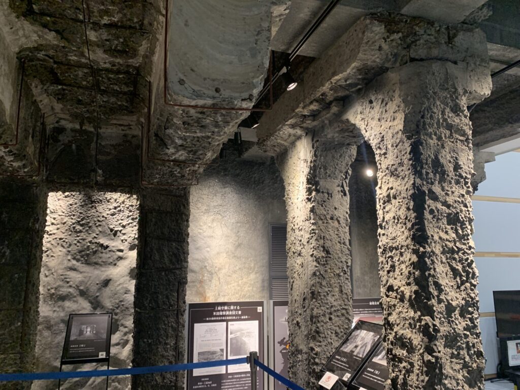 実際に被曝し、激しく焼けただれたコンクリートの柱跡。