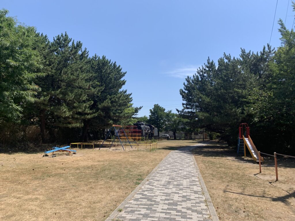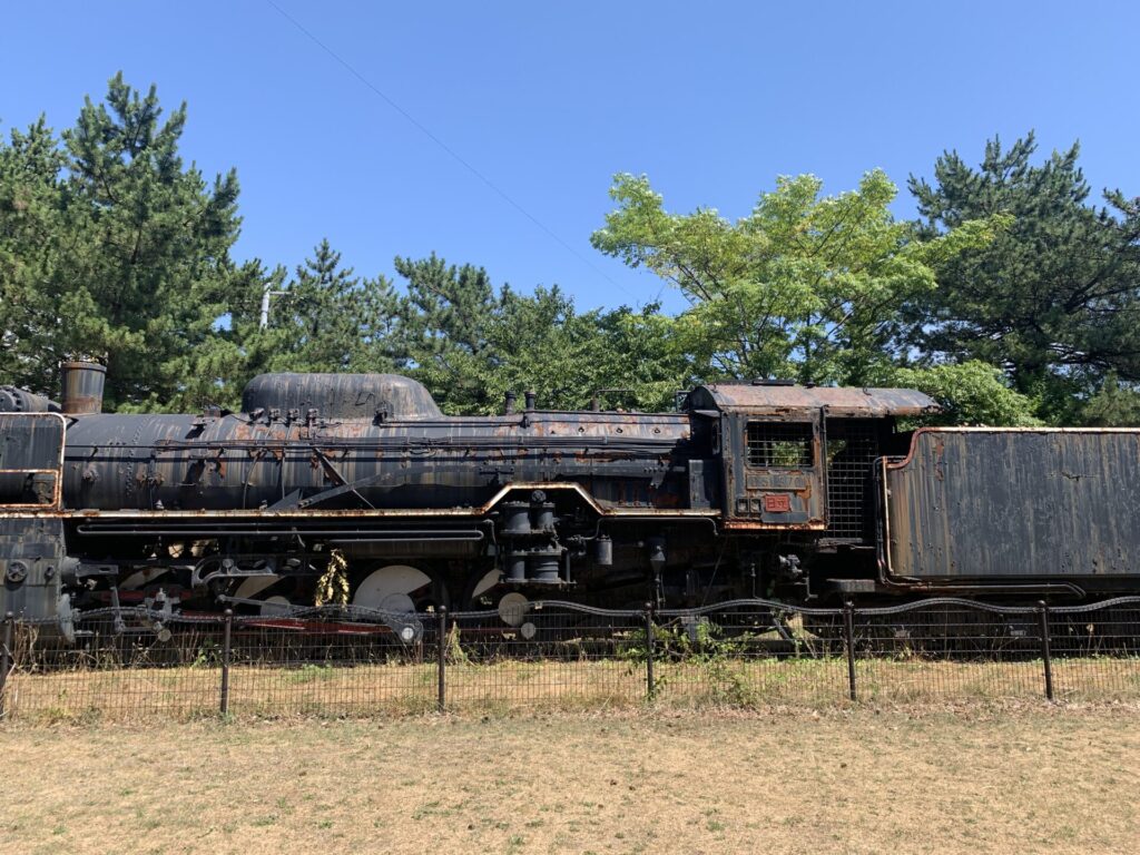 公園の奥には、SL列車の錆びついた姿もあります。