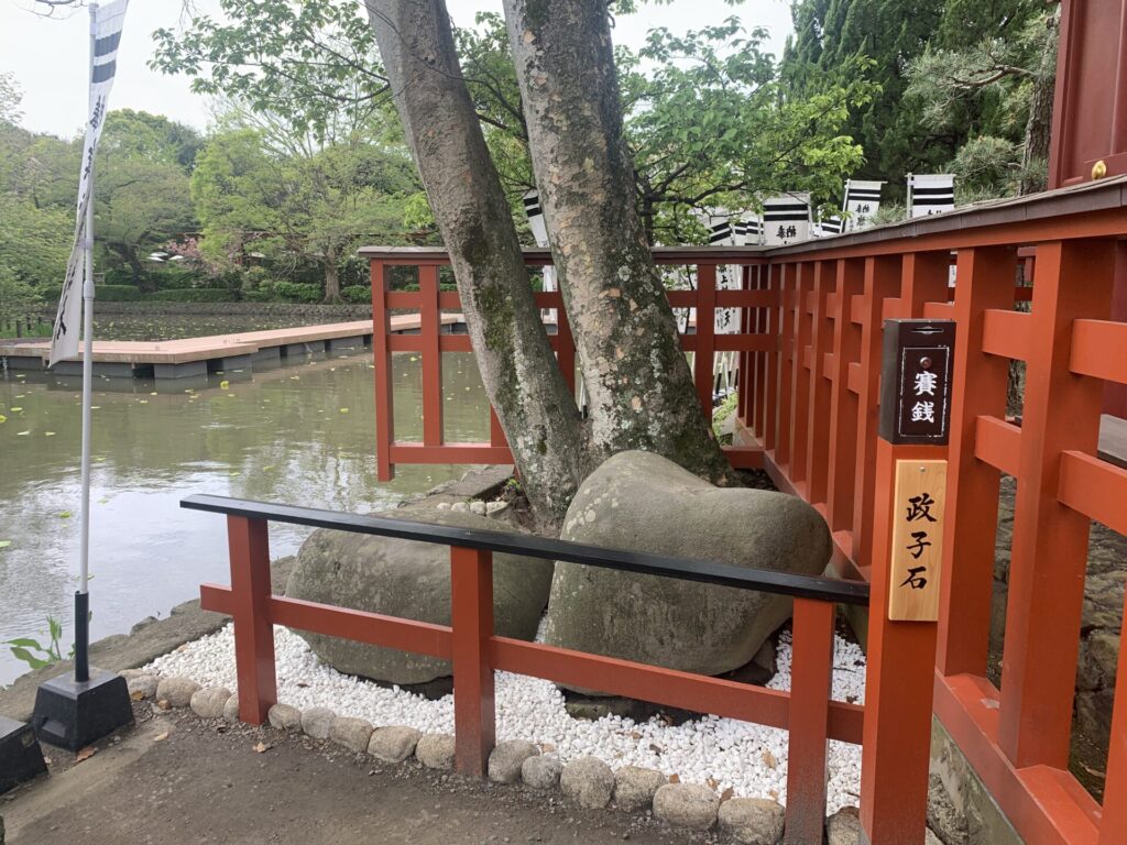 その社殿の裏側には、こちらの『政子石』なるものまで。