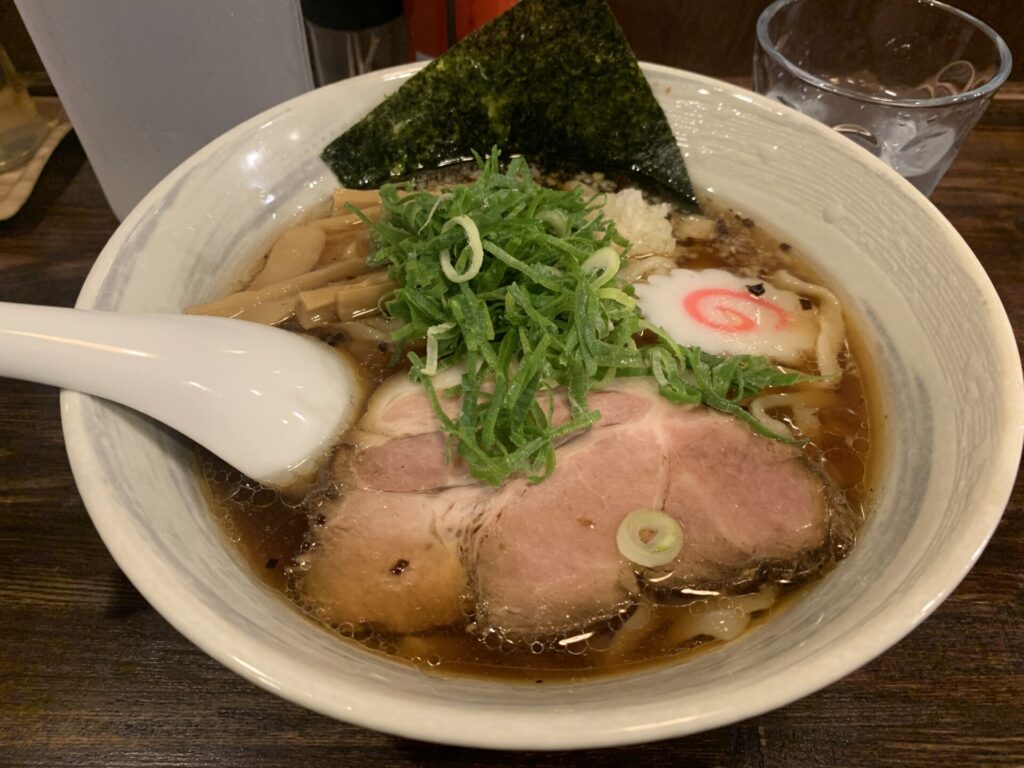 濃厚な醤油スープに合う、極太のちぢれ麺をいただきました。